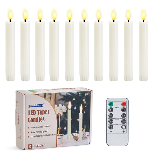 IMAGE Taper Candles, 12 Pcs Battery Operated Taper Candles 3D Wick Ivory Taper Flameless Candles with 10 Keys Remote and Timer, Flickering Flameless Taper Candles Warm White