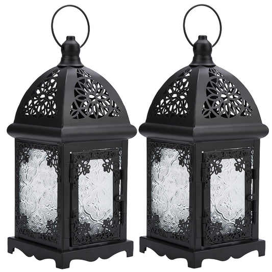 Candle Lantern Holder, Image 2 Pcs Metal Candle Lantern Holder with Transparent Glass, Vintage Hanging Lantern Tabletop Decoration Birdcage for Home Décor and Wedding Black
