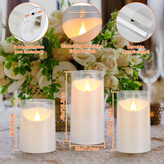 IMAGE Flickering Flameless Candles Battery Operated, 3 Pack Acrylic Shell 3D Wick LED Pillar Candles with Remote Control Timer for Wedding Christmas Home Decor (D 3"×H 4" 5" 6"), White