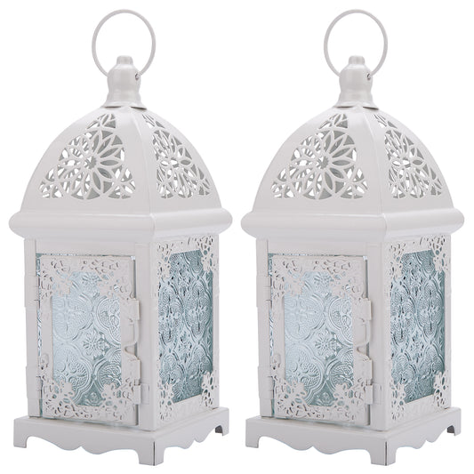 Candle Lantern Holder, Image 2 Pcs Metal Candle Lantern Holder with Transparent Glass, Vintage Hanging Lantern Tabletop Decoration Birdcage for Home Décor and Wedding White