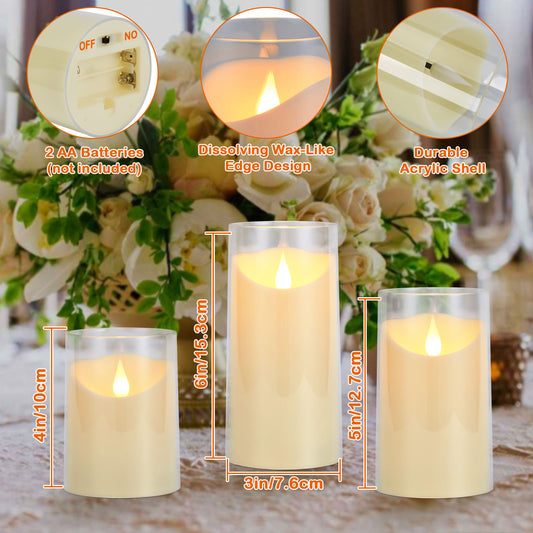 IMAGE Flickering Flameless Candles Battery Operated, 3 Pack Acrylic Shell 3D Wick LED Pillar Candles with Remote Control Timer for Wedding Christmas Home Decor (D 3"×H 4" 5" 6"), Ivory