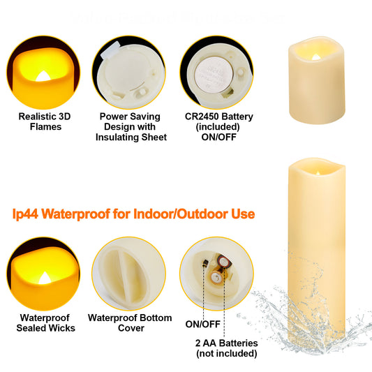 IMAGE Flameless Flickering Candles, Waterproof Battery Operated LED Pillar Candles with Votive Candles, Ivory Plastic Candles with Remote Timer for Christmas Wedding Home Decor, Set of 12