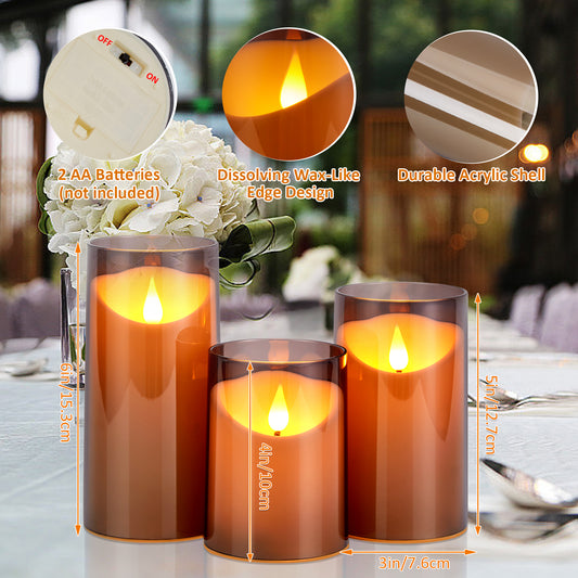 IMAGE Flickering Flameless Candles Battery Operated, 3 Pack Acrylic Shell 3D Wick LED Pillar Candles with Remote Control Timer for Wedding Christmas Home Decor (D 3"×H 4" 5" 6"), Gray