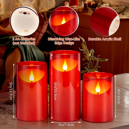 IMAGE Flickering Flameless Candles Battery Operated, 3 Pack Acrylic Shell 3D Wick LED Pillar Candles with Remote Control Timer for Wedding Christmas Home Decor (D 3"×H 4" 5" 6"), Red