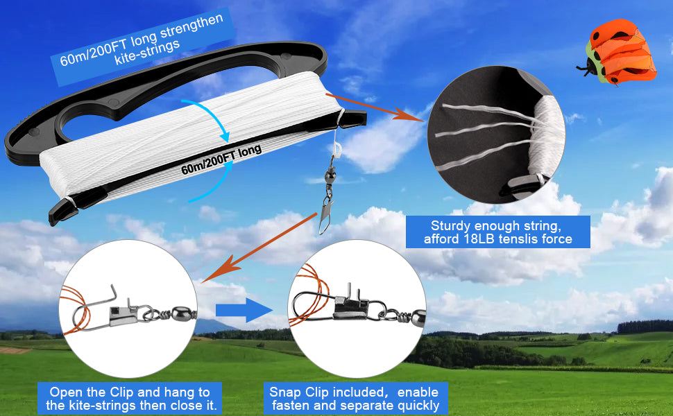 - Fly higher! Super long quality kite line (200 Feet/60 meters)! The enhanced version is more durable and less broken. The easy-to-grip handle kite spool allows you to easily control it! They will be the perfect combination!